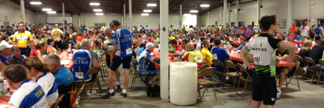 Sunday morning the storms rolled through, and delayed the start of the ride until nearly 8:30. Literally thousands of people were holed up in what is referred to as The Hub at the newly-renamed Central Missouri Events Center. There people sipped on coffee or