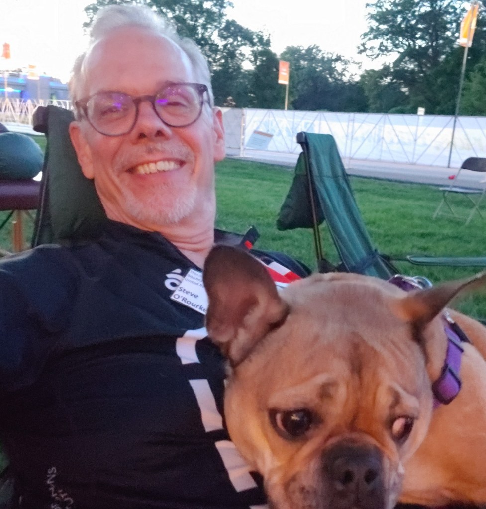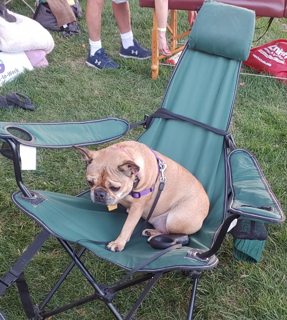 We arrived back at the team tent around 3:30, with many of our team members already enjoying the festivities and cheering riders as they arrive. I signed up for a massage as soon as I arrived; Greg Smith with Back to Work on-site massages has always been the team masseuse in the six years I’ve been riding with Team UBD. Greg knows how to hit all the right spots to relieve the body aches, and while the timing of the massage coincided with the end of my dinner (mostly prepared by Allan and Sherita Gober), I was happy to let Greg work my legs and shoulders before heading off to the mobile shower. We enjoyed more of the selections of beers donated by Ferguson Brewing, and gave some love to a couple of teammate’s pair of pugs, Hops and Barley. Here’s Barley getting some attention.