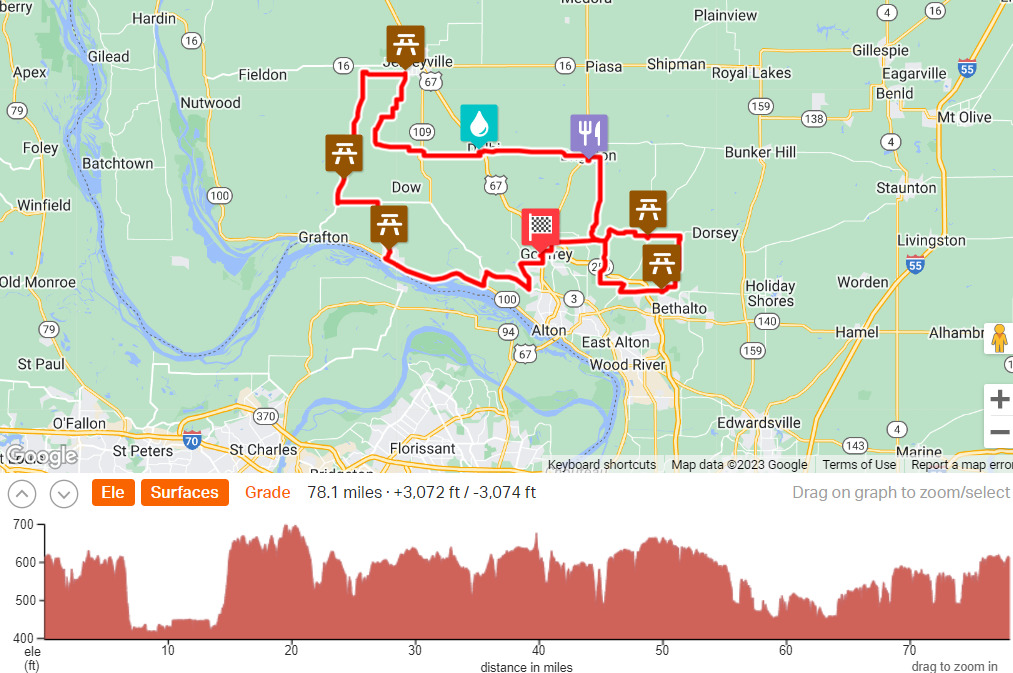 The biggest fundraising teams get queued up at the front of the gate. Team Maritz was the #1 fundraiser, with only about 30 members but some donors with deep pockets, raising $115K. Team Hogan has the largest number of riders (91!) was #2 with $73.6K, with Team UBD coming in right behind at #3 with $72.1K. Though the cool morning air was nippy, we took off from the campus and quickly found the hill down to the Great River Road, where we enjoyed the view of the mighty Mississippi before heading back up the hill from Elsah. You can see the elevation change before mile 8 and after mile 12 at the bottom of the map.