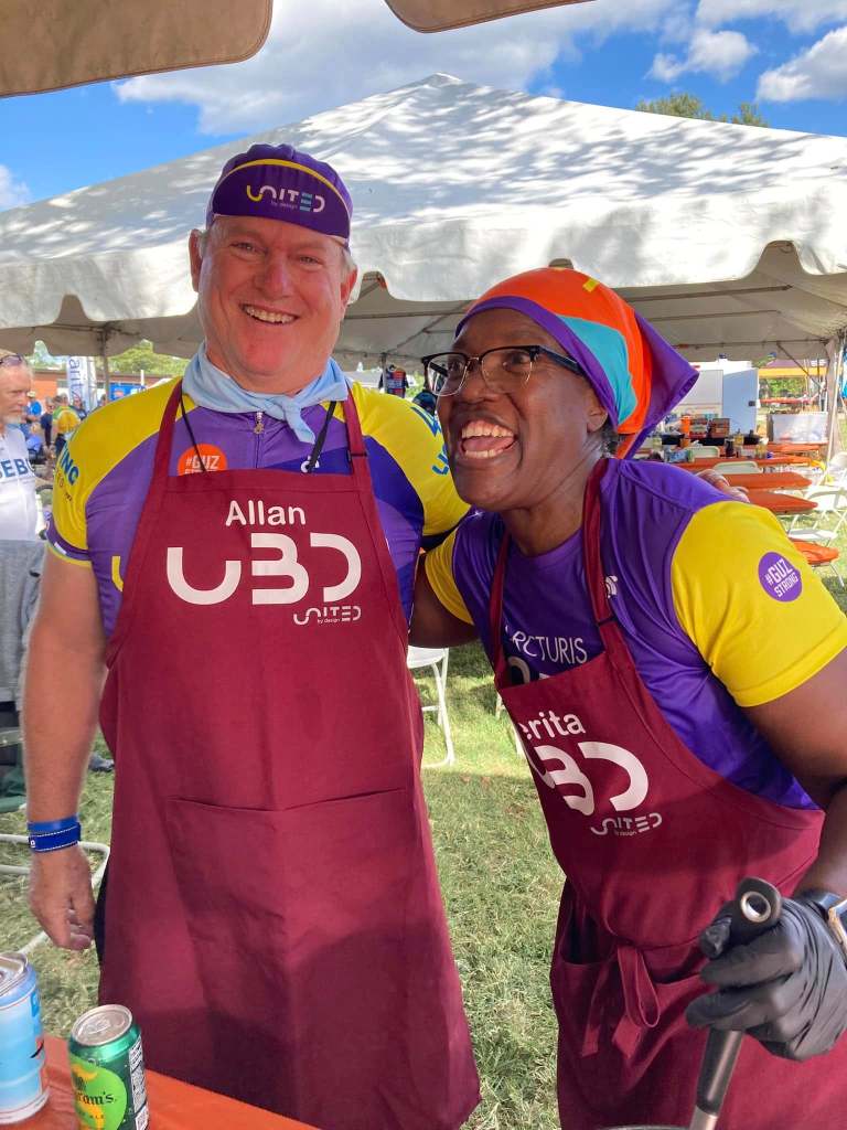 Team UBD is THE team to ride with. Harold and I shopped teams back in 2017, and chose UBD because of the amenities – food & drink, lights, masseuse, porta-potty, cell phone/battery charging station. And a dedicated group of team members preparing a feast in our tent (no cafeteria-style food will do for these guys!). I love and appreciate Allan and Sherita Gober’s tireless efforts to ensure the buffet is laid out and ready to eat. Ferguson Brewery always provides a colorful selection of ales in kegs (blonde, pale & brown), and there are mixers & spirits for cocktails as well. And always plenty of desserts. Which makes for a nice party both Friday & Saturday!