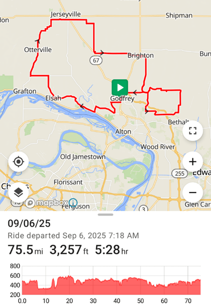 Road work on the Great River Road forced the event planners to have us climb out of the valley, and then ride back down again to a longtime rest stop in Elsah. Only to have to climb back out again. You can see the elevation gain/loss at the bottom of the image below – steep drop down, climb out, another descent and another climb. That’ll get your blood pumping and body ready to shed a layer!