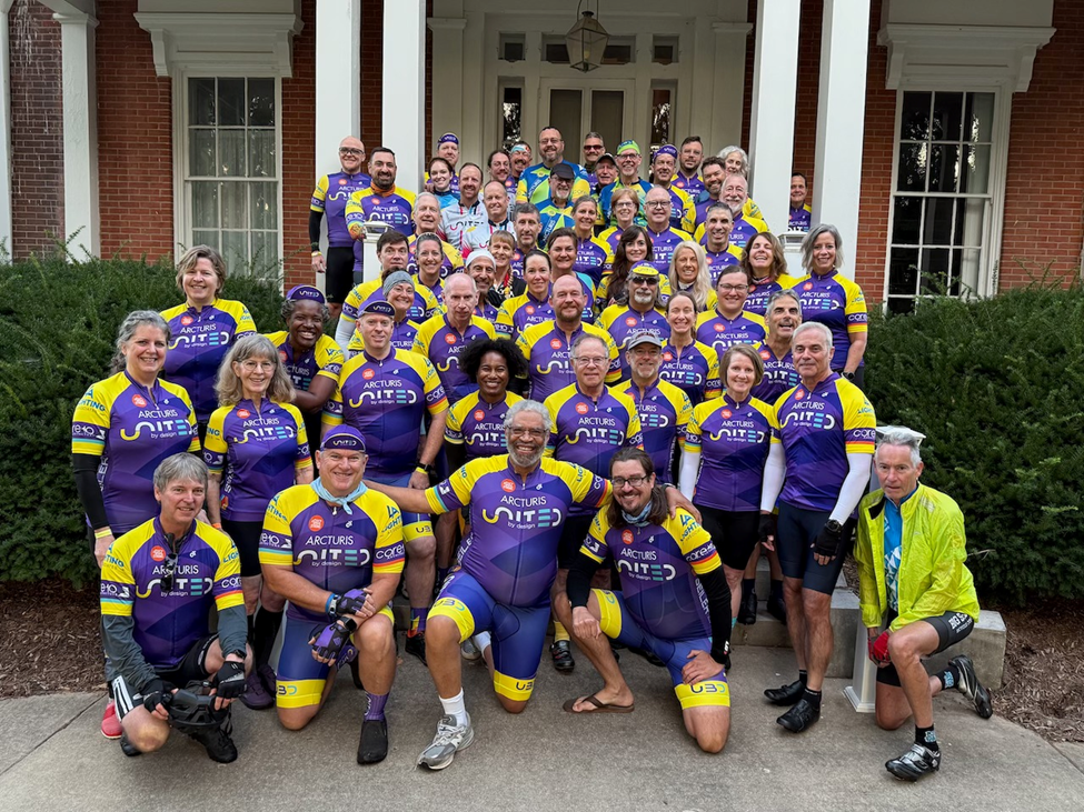 Of course, a 72° day doesn’t typically start out that way – it was more like 52° on Saturday morning when the ride started. And that felt a little more brisk once on the bike, and even more so descending into the river valley. After a quick breakfast and team photo, we all lined up in the #2 team position, since United By Design was the second largest fundraising team last year.